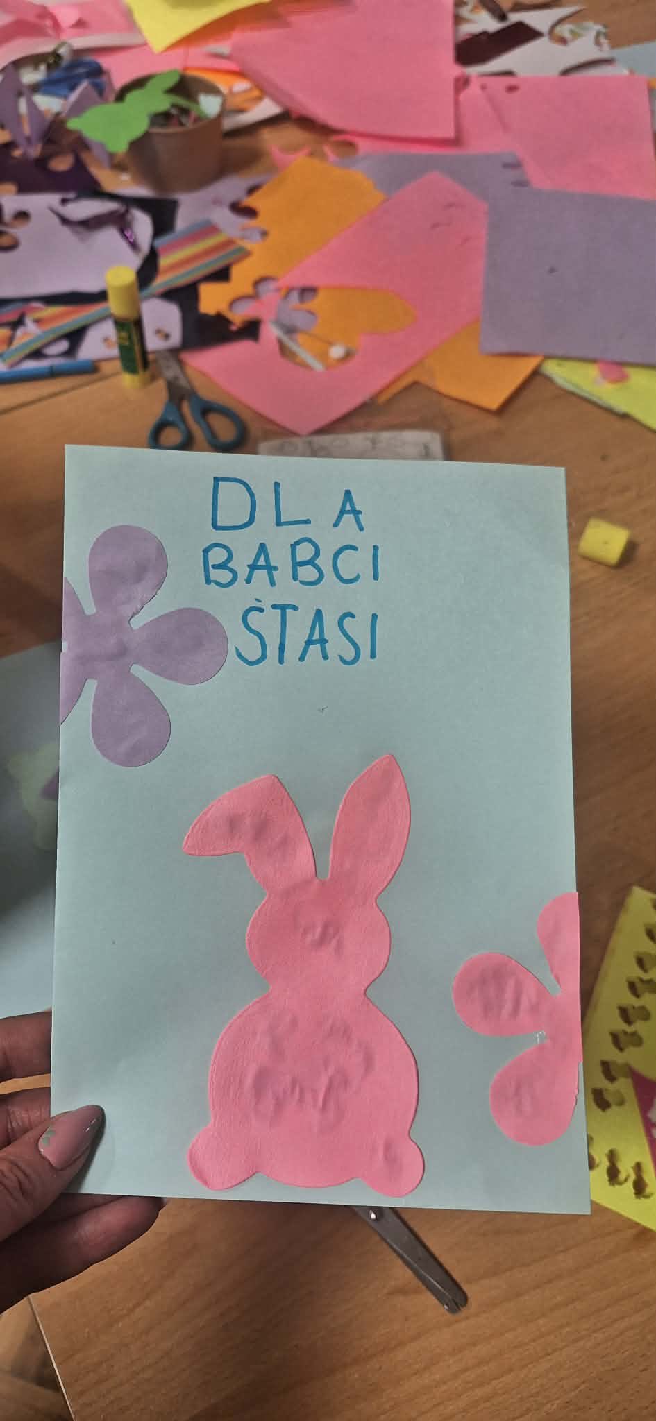 Takie zajęcia to dla dzieci nie tylko okazja do dobrej zabawy, ale też do rozwijania kreatywności, cierpliwości i sprawności manualnych. A przy okazji — do wspólnego tworzenia czegoś miłego dla bliskich. Jedna z przygotowanych kartek została podpisana: „Dla babci Stasi” — i właśnie takie drobne gesty najlepiej pokazują, ile serca dzieci wkładają w swoje prace.