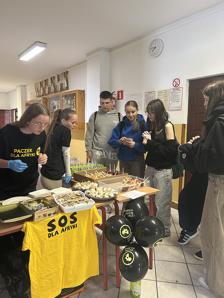 Na szkolnym korytarzu czekały na uczniów między innymi kanapeczki, galaretki, sałatka owocowa i świeżo wyciskany sok pomarańczowy. Zdjęcia pokazują, że stoisko cieszyło się sporym zainteresowaniem, a cała akcja miała nie tylko charytatywny, ale też bardzo wspólnotowy wymiar — była okazją, by połączyć codzienną szkolną aktywność z realną pomocą potrzebującym.