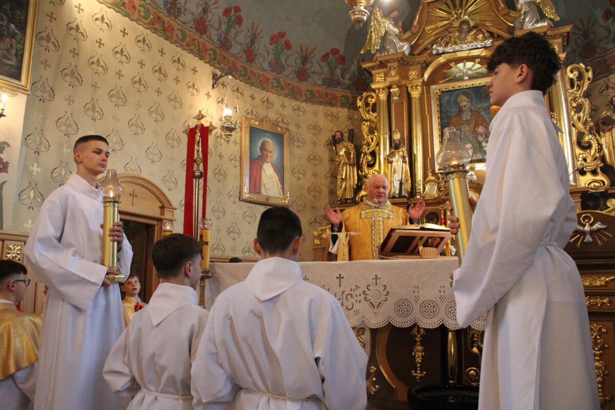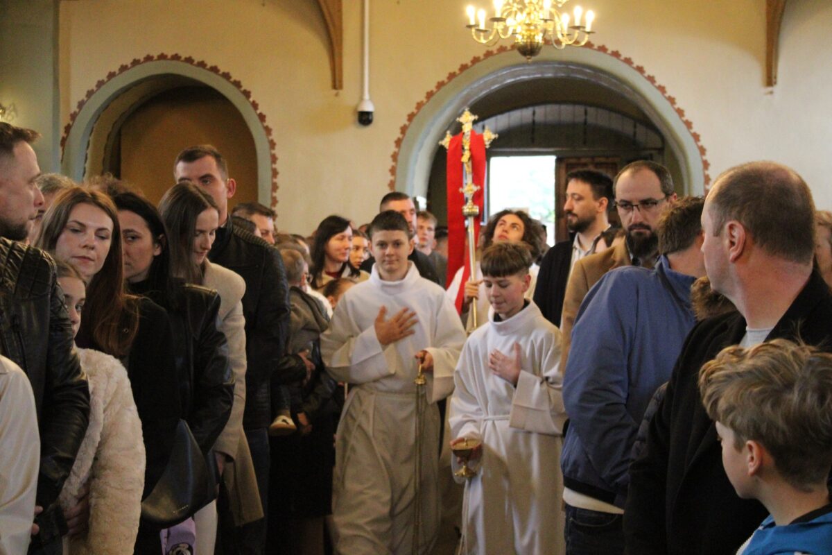 Na fotografiach z Sidziny widać, że także ten dzień ma swój własny, spokojniejszy rytm. Jest mniej dynamiczny niż poranek rezurekcyjny, ale wciąż bardzo uroczysty. Procesja z Ewangeliarzem, świąteczne szaty liturgiczne i liczny udział wiernych pokazują, że wielkanocna wspólnota w parafii nadal żyje pełnią tych świąt.