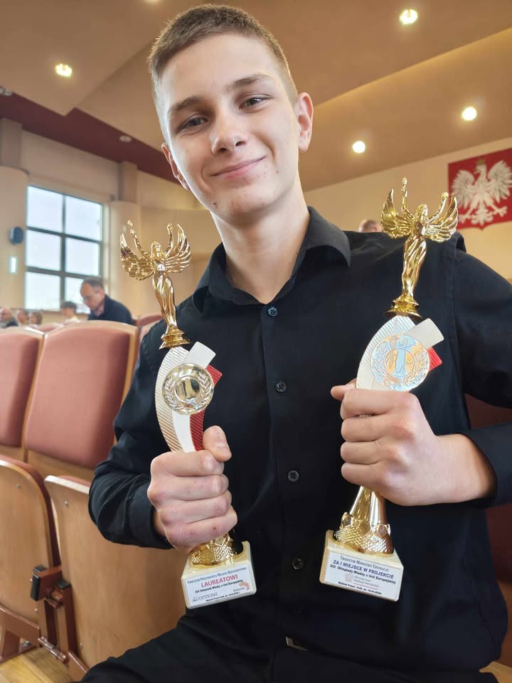 Na zdjęciach widać dwie statuetki - jedna za tytuł laureata ogólnopolskiej olimpiady, druga za pierwsze miejsce w projekcie, który Olek przygotował i przeprowadził w swojej szkole.