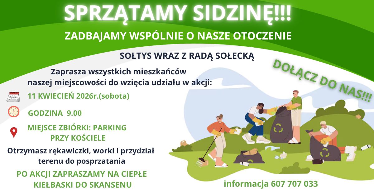 W sobotę, 11 kwietnia 2026 roku, mieszkańcy Sidziny po raz kolejny będą mogli wspólnie zadbać o swoją miejscowość. Sołtys wraz z Radą Sołecką zapraszają do udziału w akcji „Sprzątamy Sidzinę”.