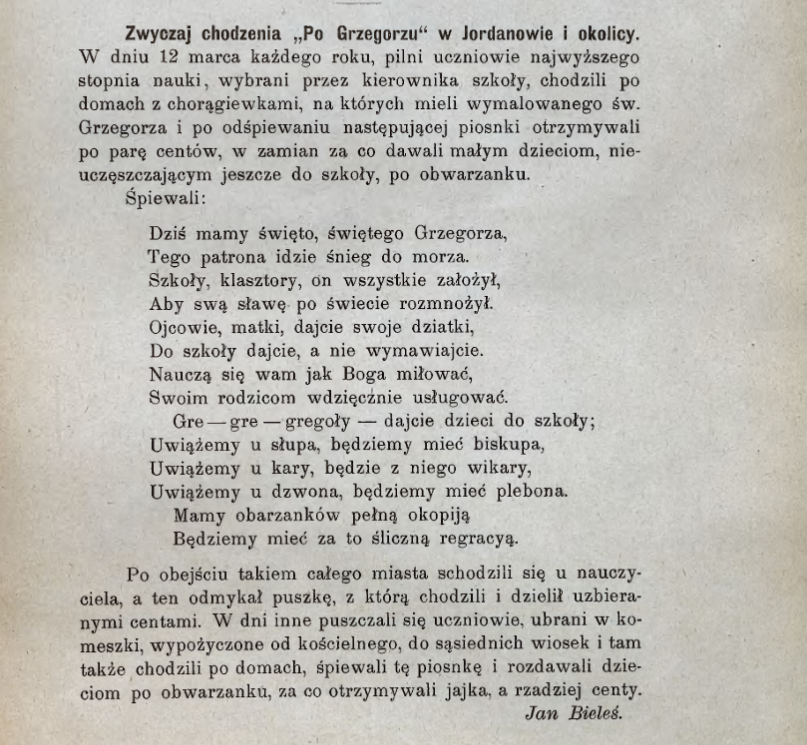 W naszym regionie świąteczny czas nie zaczynał się dopiero od koszyczka i święconki. Miał swój wcześniejszy rytm. Jednym z ciekawszych dawnych zwyczajów, odnotowanych w Jordanowie już w XIX wieku i opisanych także w 1904 roku, było chodzenie „po Grzegorzu”. W dzień św. Grzegorza, 12 marca, starsi uczniowie chodzili po domach z chorągiewkami z wizerunkiem świętego, śpiewali specjalną pieśń, a w zamian dostawali drobne datki. Małym dzieciom, które jeszcze nie chodziły do szkoły, rozdawali obwarzanki. Po obejściu miasta ruszali też do sąsiednich wiosek. To był taki dawny znak, że zima ustępuje, a przed ludźmi czas przygotowania — i do wiosny, i do świąt. Co ważne, późniejsze opracowanie naukowe jasno wskazuje, że chodziło właśnie o Jordanów w dawnym powiecie myślenickim, czyli nasz region.