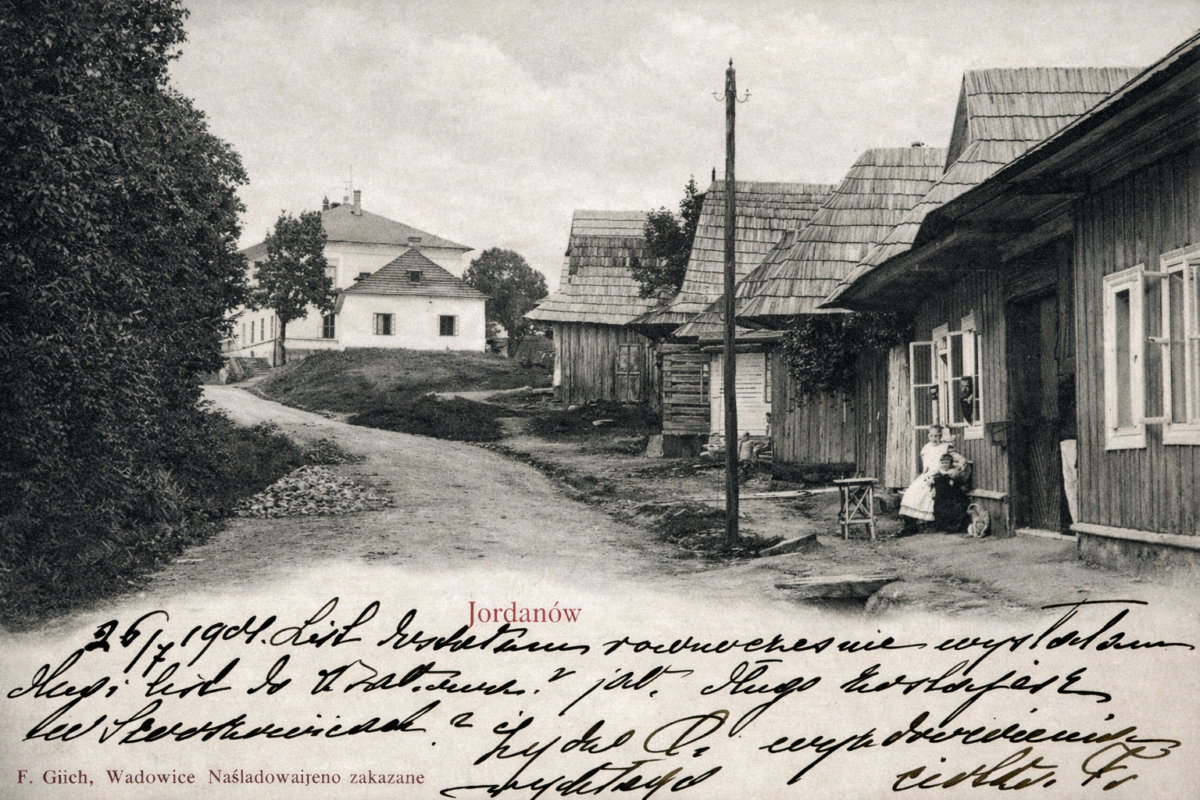 Poniżej Jordanów, ul. Kolejowa i widok w stronę szkoły. Fotografia wykorzystana na pocztówce pochodzi z 1899 roku, natomiast sama pocztówka została nadana w 1904 roku — w tym samym czasie, gdy w publikacji „Lud” opisywano zwyczaj chodzenia „po Grzegorzu” w Jordanowie i okolicy. Tak więc wyglądały wówczas ulice Jordanowa.